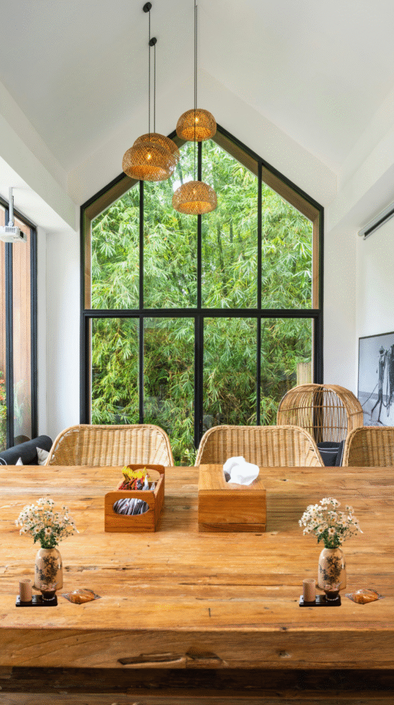 - Living Textures: Incorporate modern living room decor ideas like moss-covered stone bowls on the coffee table or “living walls” of ferns in your dining nook.