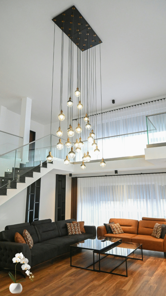 In 2026, lighting is no longer just a functional necessity; it is the “jewelry” of the room. To achieve a high-end modern living room interior design, we are moving away from standard recessed cans and toward fixtures that double as art.